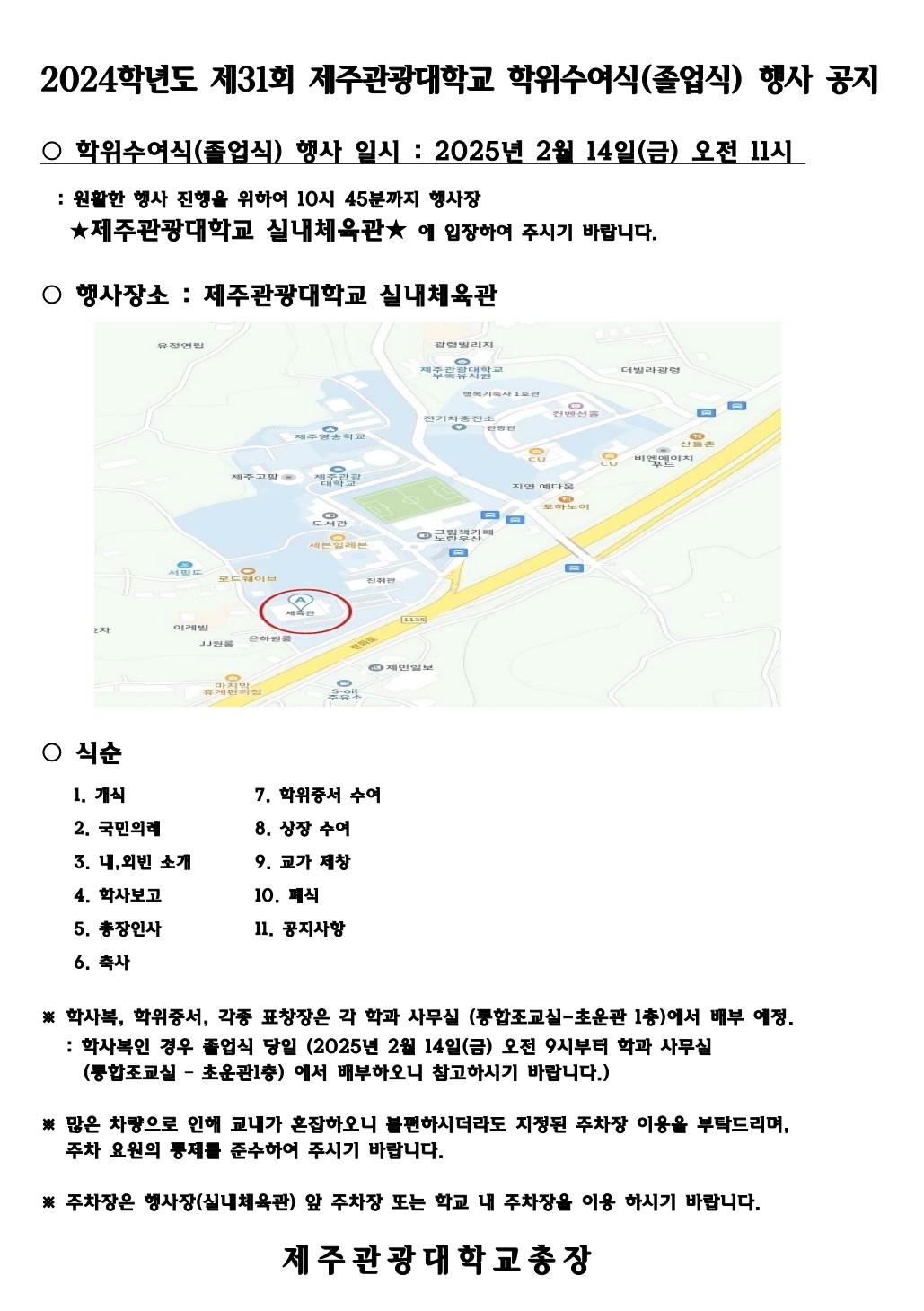 2024학년도 제31회 제주관광대학교 학위수여식(졸업식) 공지